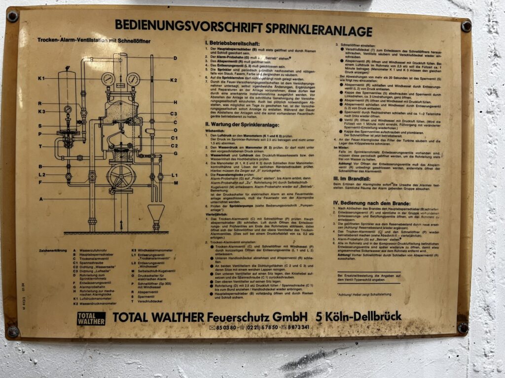 Bedeutung für den Standort: Diese Tafel ist ein wichtiges Zeugnis der industriellen Sicherheitstechnik der Lauffenmühle. Die präzisen Anweisungen verdeutlichen den hohen Wartungsaufwand, der betrieben wurde, um die Produktionsstätten und Lager vor Brandkatastrophen zu schützen.