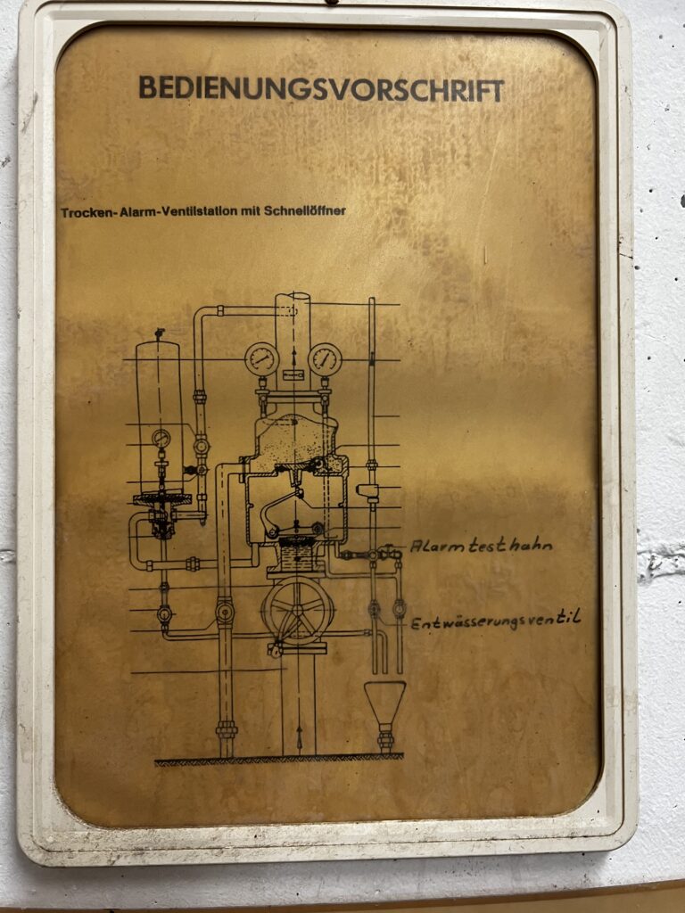 - Wöchentlich: Kontrolle der Manometerstände (K1/K3 für Luft, K2 für Wasser). Der Luftdruck im Rohrnetz muss etwa 2,5 atü betragen. Zudem muss die mechanische Alarmglocke (über Hahn G) getestet werden.