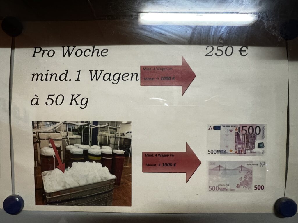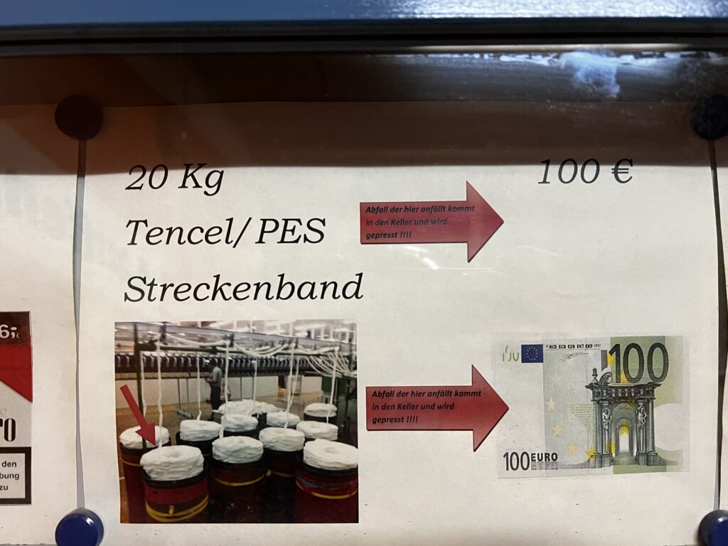 „20 kg Tencel/PES Streckenband“; daneben „100 €“; Pfeiltext: „Abfall der hier anfällt kommt in den Keller und wird gepresst!!!!“