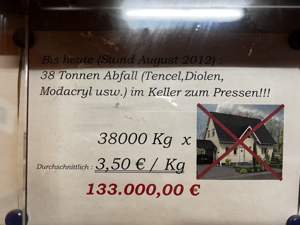 „Bis heute (Stand August 2012): 38 Tonnen Abfall (Tencel, Diolen, Modacryl usw.) im Keller zum Pressen!!!“